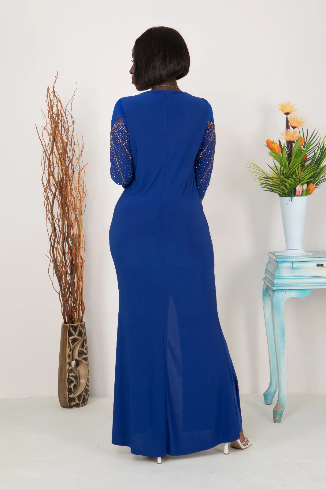 The diamond-detailed tulle neckline frames you in a sophisticated manner, while the front slit offers both graceful movement and captures attention.