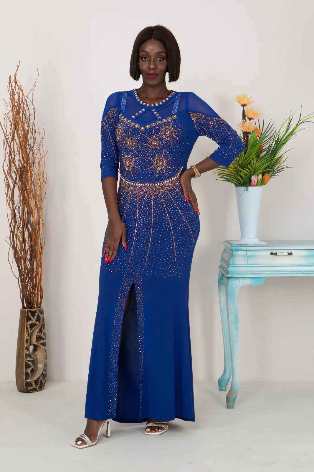The Zosma dress is a masterpiece that combines elegance and luxury. Crafted from gold diamond stone sendy fabric, this enchanting dress exudes a captivating radiance. Featuring a diamond-detailed tulle neckline, front slit, and meticulous craftsmanship, this dress is a perfect embodiment of elegance and sophistication in every detail.